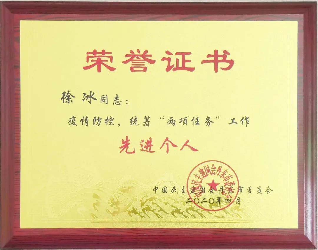 2020年4月15日中國民主建國會丹東市委員會,授予丹東欣時代生物醫(yī)藥科技有限公司總經(jīng)理徐冰,丹東市疫情防控,統(tǒng)籌“兩項任務(wù)”工作先進(jìn)個人稱號。以表彰丹東欣時代生物醫(yī)藥科技有限公司總經(jīng)理徐冰在疫情防控期間所作出的突出貢獻(xiàn)。