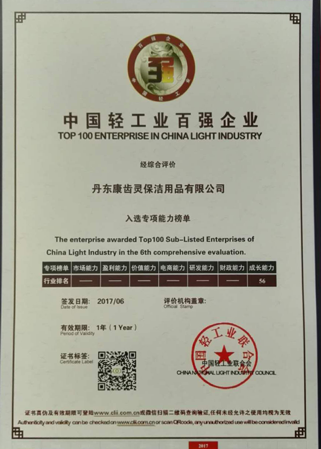 恭喜丹東欣時代生物醫(yī)藥科技有限公司(原丹東康齒靈保潔用品有限公司)榮獲2017年度中國輕工業(yè)百強企業(yè)。